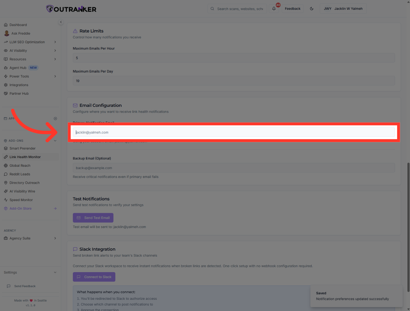 “Now go to the Email Configuration section. Click Primary Notification Email. Enter the main email address that should receive link health alerts.”